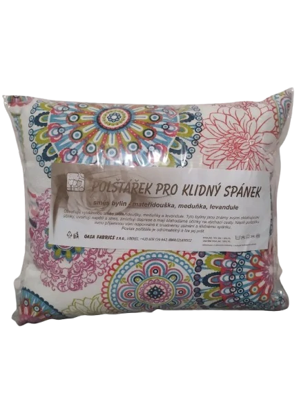 Polštářek pro klidný spánek, směs bylin - mateřidouška, meduňka, levandule. Tyto byliny jsou známy svými zklidňujícími účinky, uvolňují napětí a stres, zmírňují deprese a mají blahodárné účinky na dýchací cesty. Náplň polštářku svou příjemnou vůní napomáhá k snadnému usínání a klidnému spánku. Povlak polštáře je odnímatelný a lze jej prát.