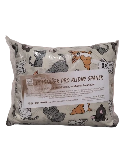 Polštářek pro klidný spánek, směs bylin - mateřidouška, meduňka, levandule. Tyto byliny jsou známy svými zklidňujícími účinky, uvolňují napětí a stres, zmírňují deprese a mají blahodárné účinky na dýchací cesty. Náplň polštářku svou příjemnou vůní napomáhá k snadnému usínání a klidnému spánku. Povlak polštáře je odnímatelný a lze jej prát.
